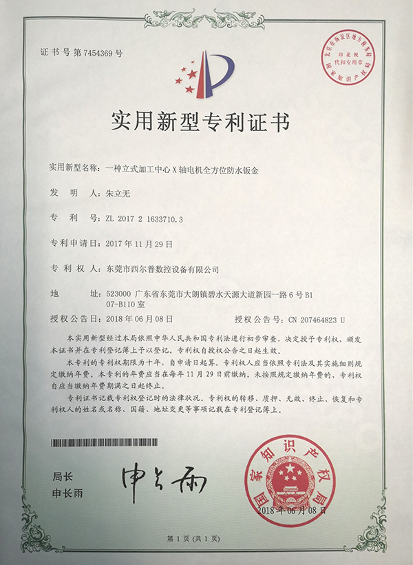 一種立式加工(gong)中心X軸電機全方(fang)位防水钣金證書(shū)